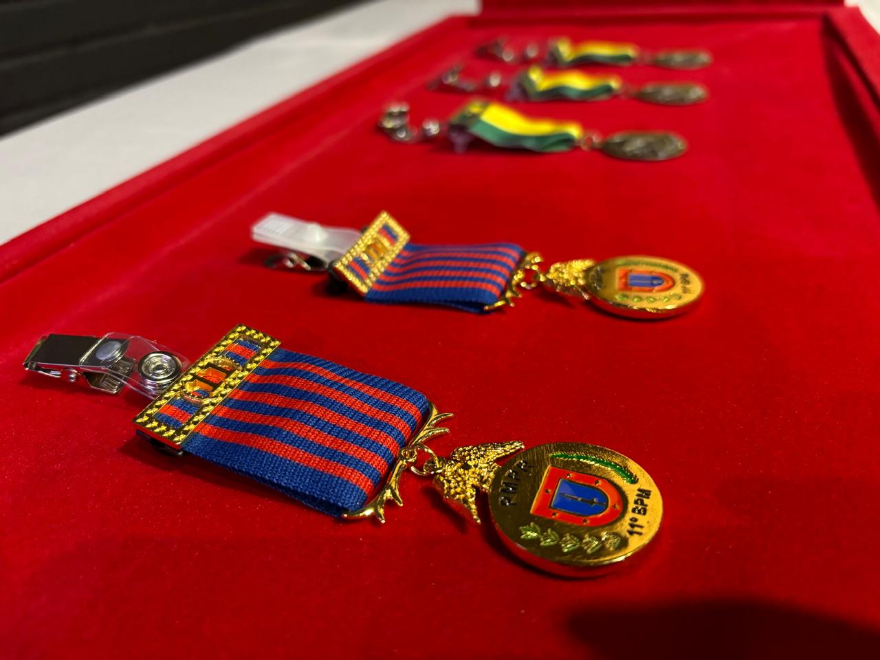 Na oportunidade, foram entregues as Medalhas de Bronze, concedidas aos policiais militares que completaram 10 anos de serviço com dedicação e disciplina. Também foi realizada a entrega da Medalha Sentinela do Centro-Oeste, honraria criada pelo 11º Batalhão de Polícia Militar e destinada aos policiais que se destacaram no desempenho de suas funções na área de atuação da unidade.