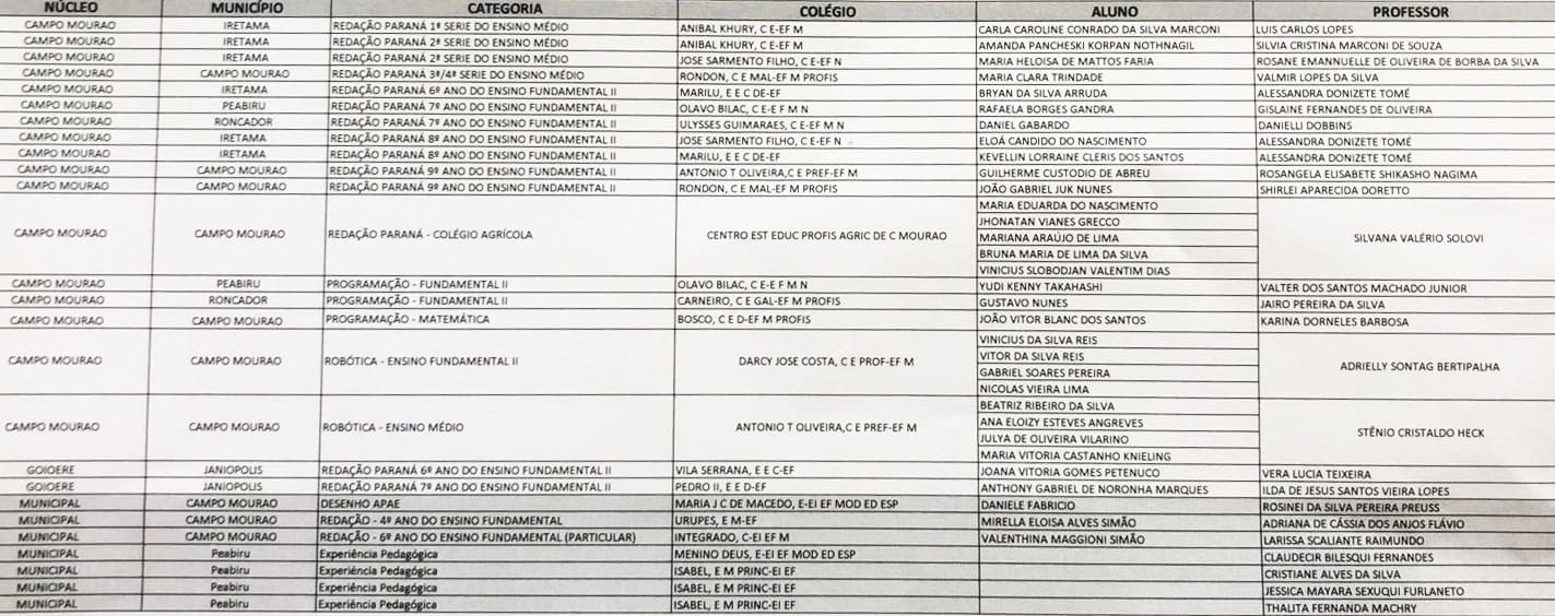 Pelo menos 26 escolas da região, sendo 10 de Campo Mourão, 6 de Iretama, 6 de Peabiru, 2 de Roncador e 2 de Janiópolis estão entre os estabelecimentos de ensino dos 399 municípios do Paraná premiadas no Programa Agrinho 2023. O tradicional concurso é desenvolvido pelo Sistema Federação da Agricultura do Paraná (Faep) e Serviço Nacional de Aprendizagem Rural (Senar-PR). Cerca de 800 mil alunos das redes de ensino pública e privada participaram este ano. Veja na tabela abaixo a lista completa dos vencedores da Regional Campo Mourão.