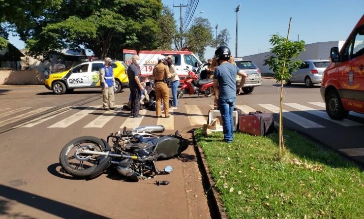 A Honda 160 seguia pela Avenida, no sentido Lar Paraná/Centro, enquanto a Shineray subia a rua Pitanga, cruzando a preferencial, causando a colisão. Com o impacto, tanto a mulher quanto o homem ficaram feridos. O rapaz homem sofreu ferimentos nos braços e escoriações pelo corpo, enquanto a mulher ferimentos na face.