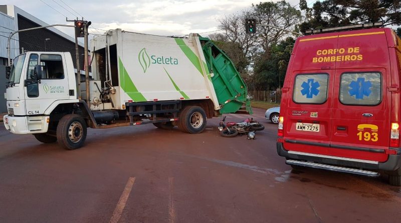 Acidente envolvendo caminhão coletor de lixo deixa motociclista ferido