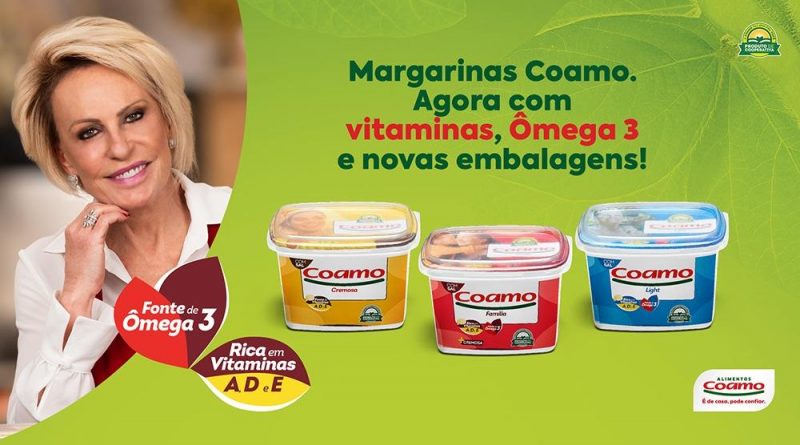 A linha de margarinas da Coamo , consagrada e bem conceituada pelos consumidores, está com novo visual. Para divulgar essa novidade a Coamo mais uma vez conta com a sua embaixadora Ana Maria Braga, que desta vez não está sozinha. Entrou no ar esta semana a 2ª fase da campanha que apresenta além de Ana Maria também participantes da cadeia produtiva, desde aqueles que trabalham no campo, passando pelo processo de fabricação até a mesa de milhares de brasileiros. Isso mostra o quanto os produtos desenvolvidos por cooperativa são mais saudáveis, tanto pela proximidade com o campo quanto pelo trabalho realizado pelos cooperados. Ainda mais com a nova fórmula das Margarinas Coamo, que agora vem também com vitaminas e Ômega 3.