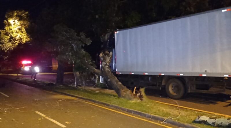 Árvore cai sobre caminhão na Avenida Goioerê, em Campo Mourão, e deixa prejuízos