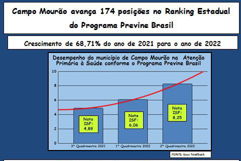 O desempenho de Campo Mourão na atenção primária à Saúde tem avançado de forma significativa, conforme foi constatado pelo Programa nacional Previne Brasil. De 2021 para 2022, o município teve um crescimento de 68,71% e avançou 174 posições no ranking estadual do programa.