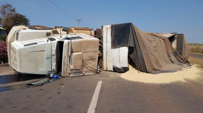 Uma carreta bitrem com placas de Maringá carregada com uma carga de farelo de soja avaliada em R$ 50 mil tombou no fim da manhã desta quarta-feira (21), na rodovia PR-158, no trecho entre Campo Mourão e Peabiru. Apesar da gravidade, o motorista do caminhão, de 27 anos, sofreu apenas ferimentos leves. Ele recusou atendimento médico.