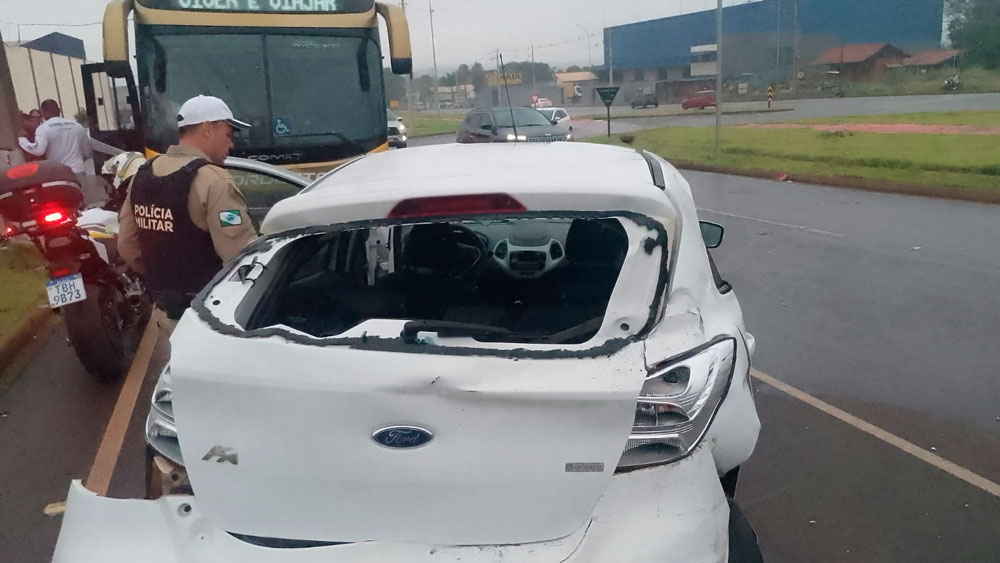 De acordo com as informações apuradas no local, o veículo, um Ford Ka pertencente à Santa Casa, seguia no sentido Maringá a Campo Mourão quando a condutora tentou realizar uma conversão no contorno para retornar em direção a Peabiru. Segundo relato da própria motorista, ao verificar os lados, não visualizou outros veículos e iniciou a travessia, momento em que o automóvel foi atingido na traseira por um ônibus.
