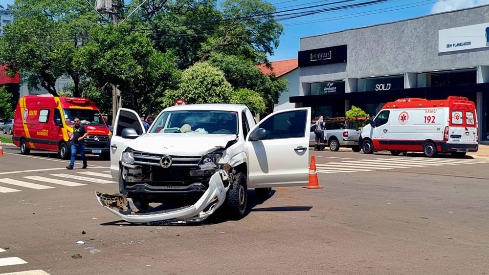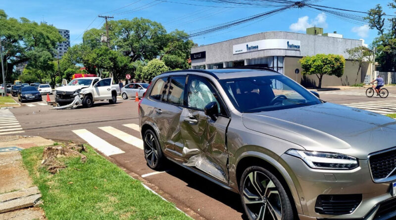 Um acidente envolvendo um carro de luxo e uma caminhonete deixou pelo menos duas pessoas feridas na manhã desta sexta-feira (26), na área central de Campo Mourão. A batida ocorreu no cruzamento da Avenida Irmãos Pereira com a Rua Laurindo Borges, após um veículo SUV Volvo XC90 invadir a via preferencial e ser atingido por uma caminhonete VW Amarok.