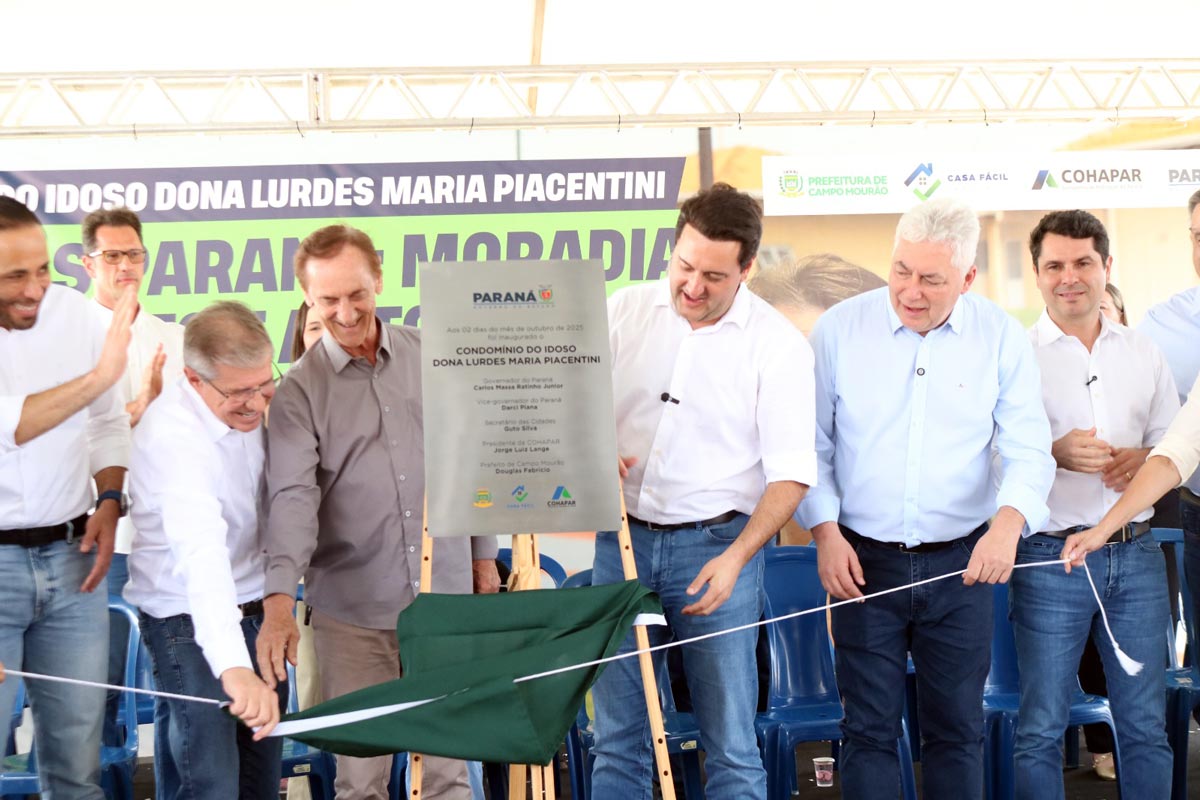 Durante a entrega do condomínio, Ratinho destacou que o Paraná foi reconhecido como o único da América do Sul com o título de estado amigo do idoso porque tem o maior programa habitacional do País voltado à terceira idade. “O Condomínio do Idoso é um dos pilares desse programa, um espaço que dá oportunidade para o idoso morar em um ambiente compartilhado com outras pessoas”, destacou o governador. “Estamos muito felizes de estar aqui em Campo Mourão inaugurando mais um condomínio do idoso”, complementou, ao lembrar que o projeto foi iniciado junto à Cohapar pelo ex-prefeito Tauillo Tezelli. “E agora está sendo entregue pelo Douglas”, frisou.