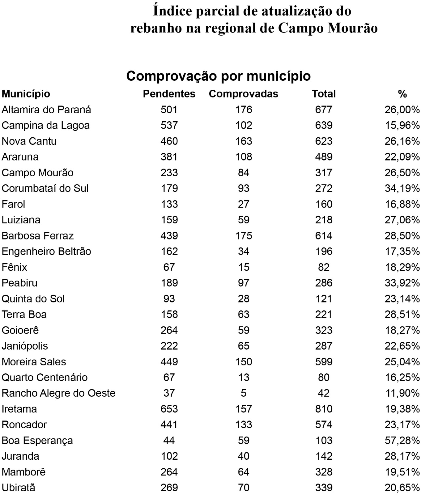 Até a segunda-feira, o município de Boa Esperança registrava o maior percentual de comprovação: 57,28%. Em seguida Corumbataí do Sul (34,19%), Peabiru (33,92%), Terra Boa (28,51%), e Juranda (28,17%). As cidades com as menores taxas de comprovações são: Rancho Alegre D’Oeste (11,90%), Campina da Lagoa (15,96%), Quarto Centenário (16,25%) e Farol (16,88%). Veja como anda a atualização por município na tabela abaixo.