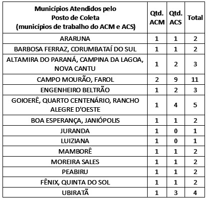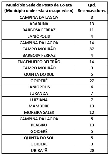 O coordenador de área do IBGE em Campo Mourão, Marcos Vinicius Vicente, informou que na área de abrangência da Agência, 323 vagas temporárias estão sendo oferecidas em 22 municípios. Não fazem parte da agência as cidades de Iretama, Roncador e Terra Boa. Veja na tabela abaixo as vagas e cargos por cidades. O processo era para ter sido realizado no ano passado, mas foi adiado devido a pandemia de coronavírus (Covid-19). Do total de vagas, 281 são para recenseadores além de mais 42 para ACM e ACS.