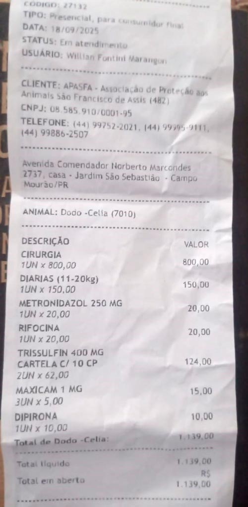 Para arcar com a última cirurgia, que, mesmo com o apoio de clínicas veterinárias e associações da cidade, com descontos, somou R$ 1.139,00, o abrigo lançou uma rifa de nomes. Por não ser uma ONG ou associação formal, o abrigo não recebe recursos públicos para se manter.