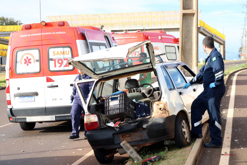 Com o impacto na traseira, o condutor do Uno perdeu o controle da direção e o carro colidiu violentamente contra um poste da rede pública de energia elétrica, ficando bastante danificado.