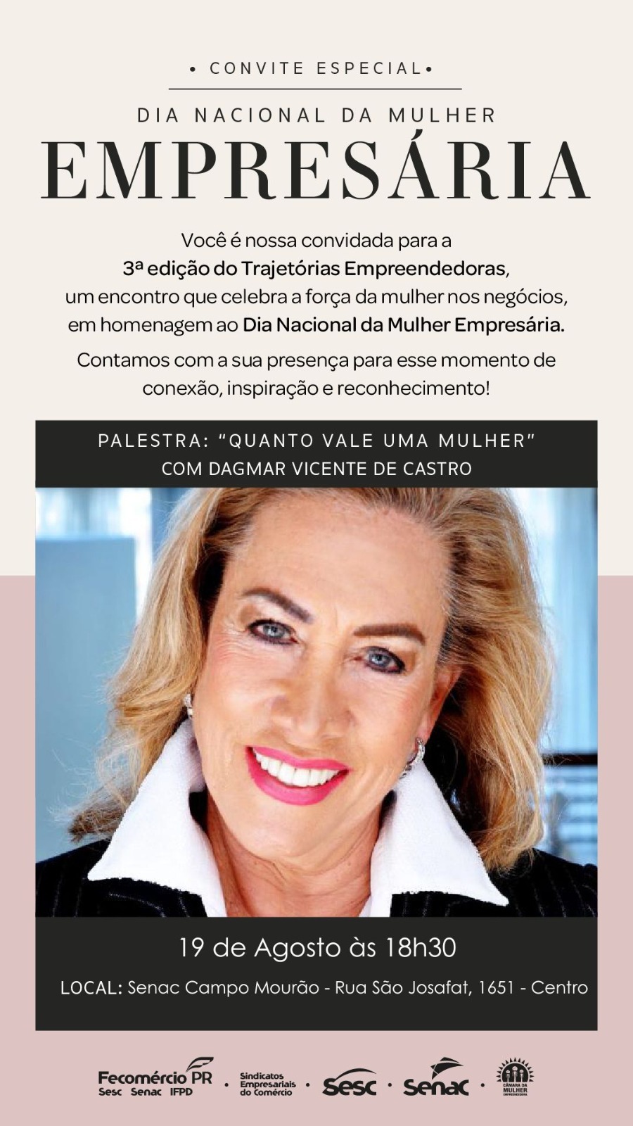 “Quanto vale uma mulher” será o tema do talk show com Dagmar Vicente de Castro, que acontece nesta terça-feira (19), na terceira edição do Trajetórias Empreendedoras, evento que comemora o Dia Nacional da Mulher Empresária. A palestra será transmitida on-line de Curitiba para 20 cidades paranaenses com unidades do Senac, Sesc e da Câmara da Mulher Empreendedora e Gestora de Negócios (Cmeg).
