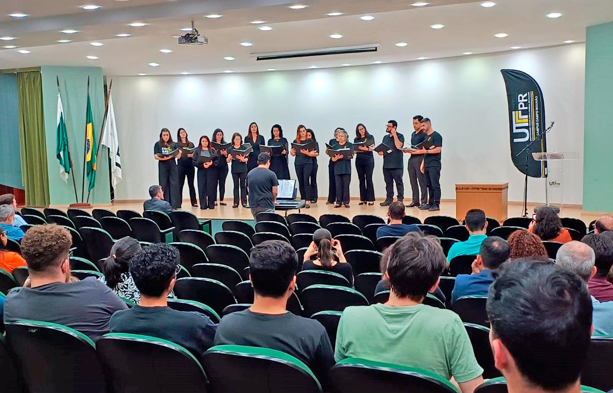 A abertura da Feira de Profissões 2025, na noite dessa terça-feira (2), iniciou com uma apresentação do Coral do Campus. Em seguida, a diretora de Graduação e Educação Profissional (Dirgrad), Leila Larisa Medeiros Marques, fez uma fala inicial, representando a comissão organizadora.