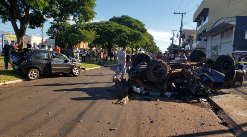Uma câmera de segurança registrou quando a camionete Hilux trafegava pela Avenida e um GM Celta, de cor escura, entrou na frente ao tentar acessar um posto de combustível. O motorista da Hilux ainda tentou desviar, mas não conseguiu evitar o choque contra a lateral do Celta. A camionete ainda quebrou um poste antes de capotar e ficar com as rodas para cima.
