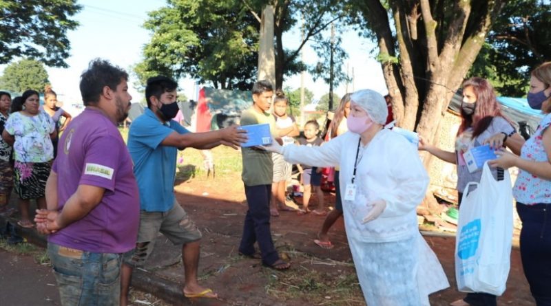 Servidores municipais das secretarias de Ação Social, Fiscalização e Meio Ambiente estiveram na manhã desta quinta-feira (25) no local ocupado por um grupo de indígenas. Além de entregar máscaras e álcool em gel às famílias, a secretária municipal de Ação Social, Márcia Calderan, repassou orientações quanto ao uso e cuidados.