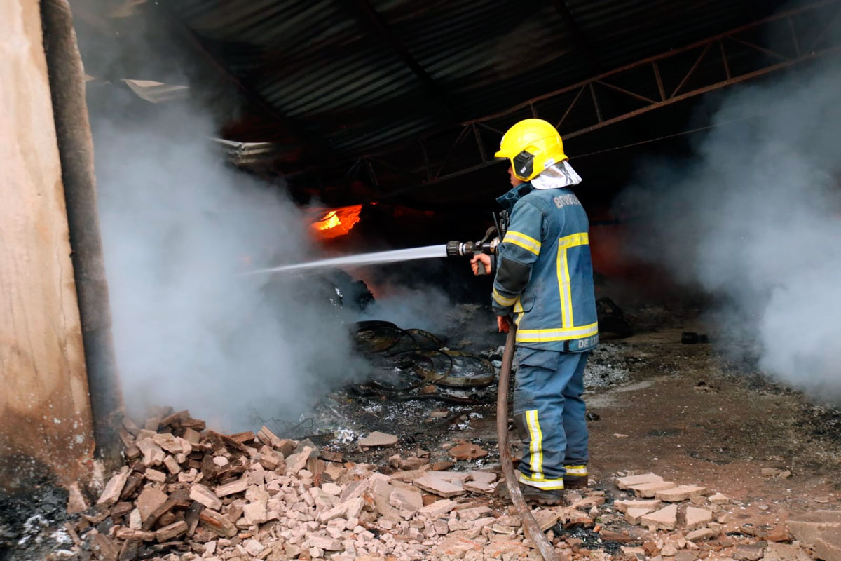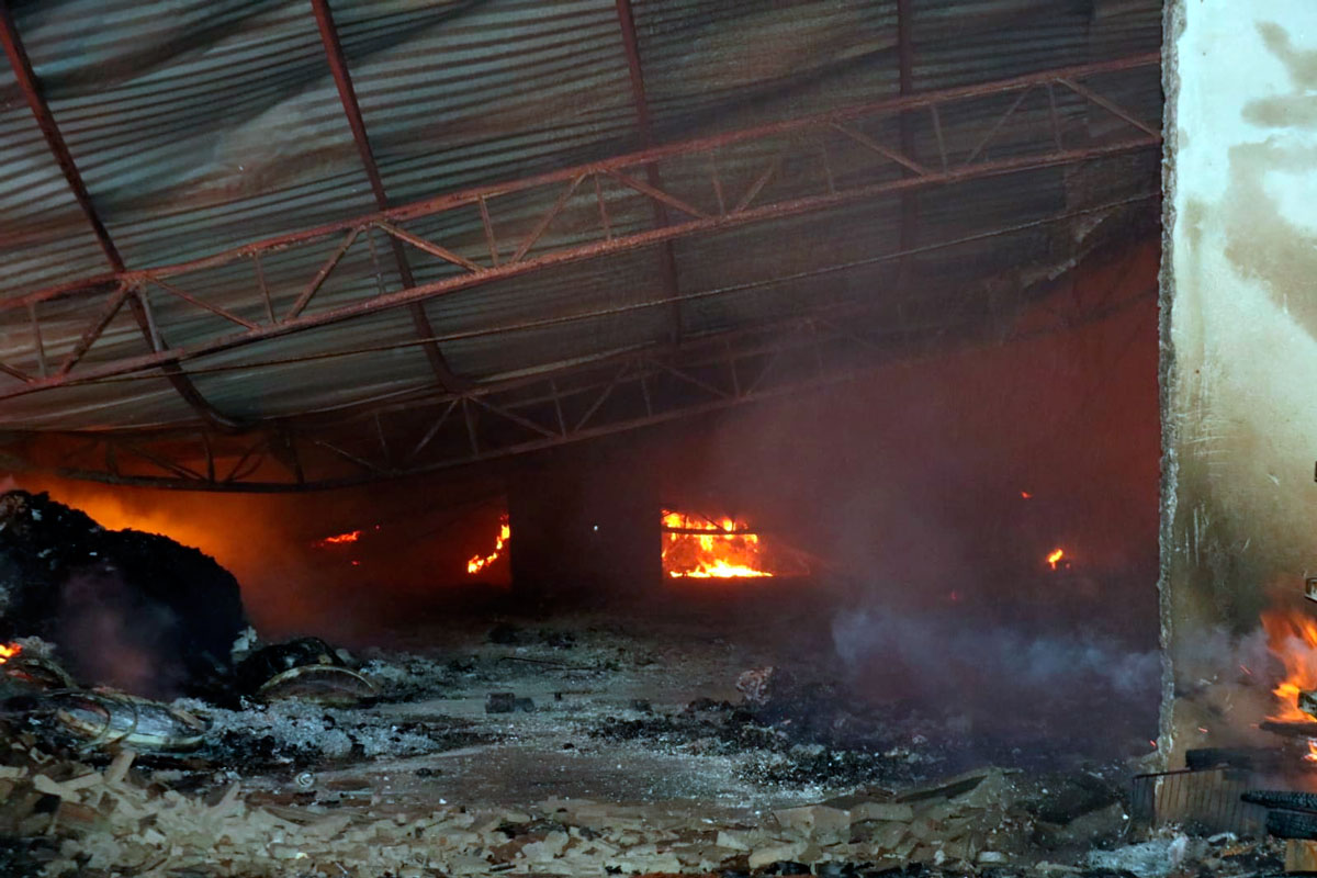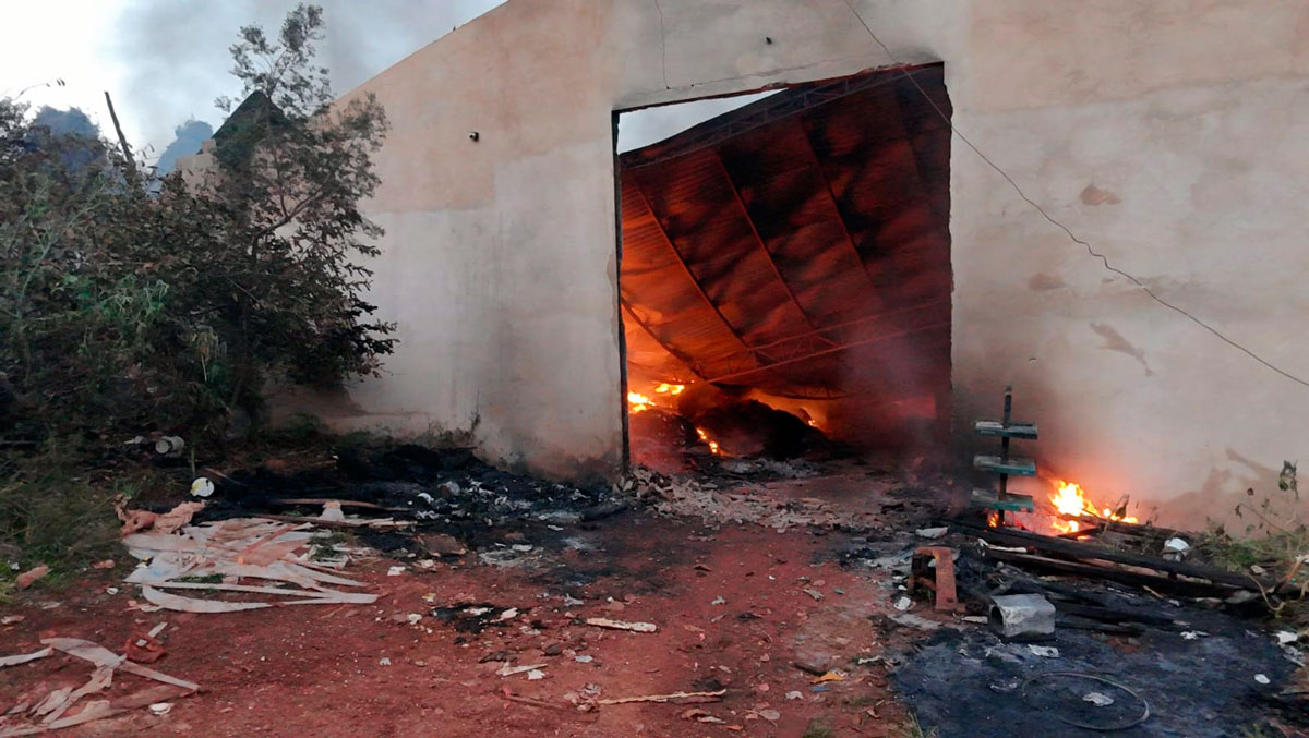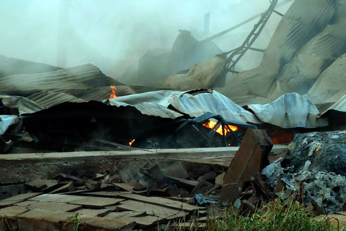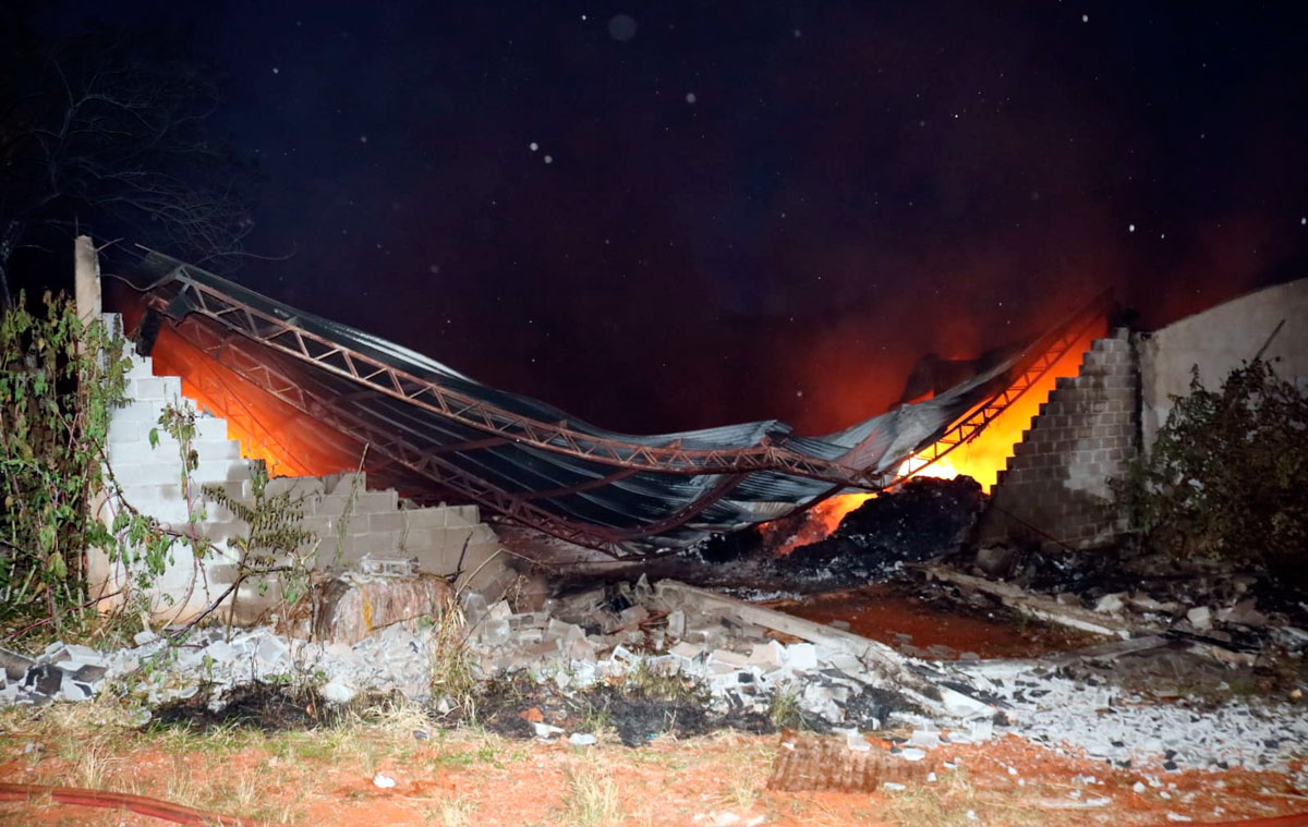 O fogo teve início no início da madrugada deste domingo e as equipes ainda permanecem no local no combate às chamas. Já são mais de 8 horas de trabalho. Já foram utilizados quase 100 mil litros de água e mais de 10 homens estão empregados na ação. As estruturas dos barracões ficaram completamente destruídas. Os telhados das duas construções desabaram e as paredes colapsaram. Nada foi salvo.