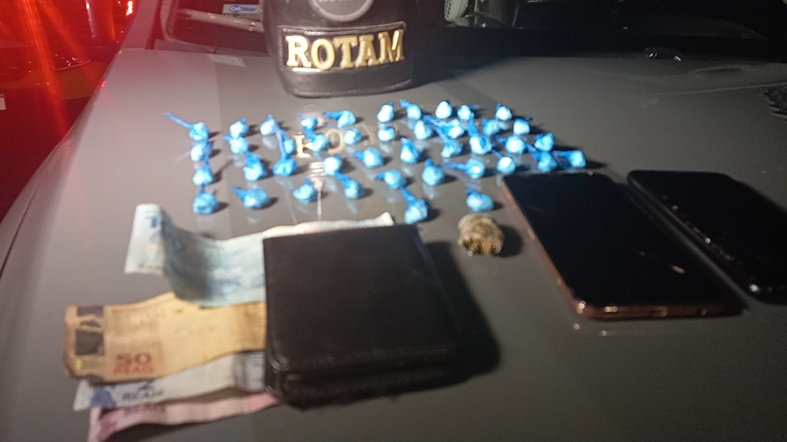 Durante a varredura à residência, em um dos quartos foi encontrado um pacote com 42 invólucros de cocaína prontos para comercialização, cerca de 3,6 gramas de maconha, dois aparelhos celulares, e uma carteira com R$ 157,00 em espécie. Havia o documento de um jovem de 18 anos, encontrado e preso posteriormente.