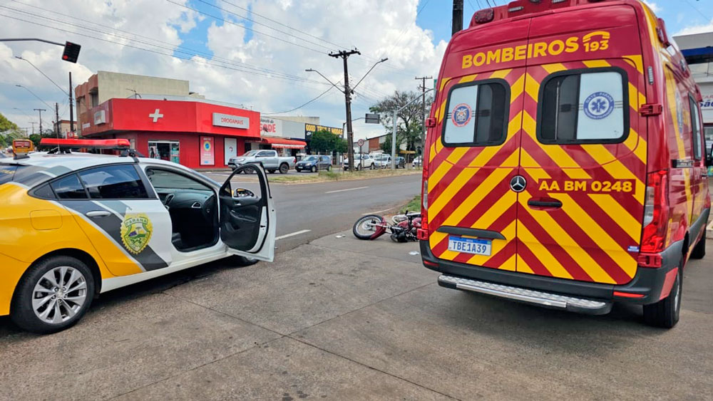 Uma mototaxista de 24 anos ficou ferida após ser atingida por um veículo na tarde desta sexta-feira (17), em Campo Mourão. O condutor que causou o acidente fugiu do local sem prestar socorro à vítima.