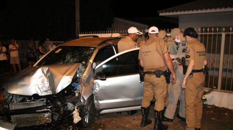 Em seguida, o carro saltou o meio fio, subiu a calçada e bateu violentamente contra uma árvore, parando somente após atingir o muro de uma casa. O veículo teve a frente completamente destruída. A batida foi tão forte que a árvore caiu.