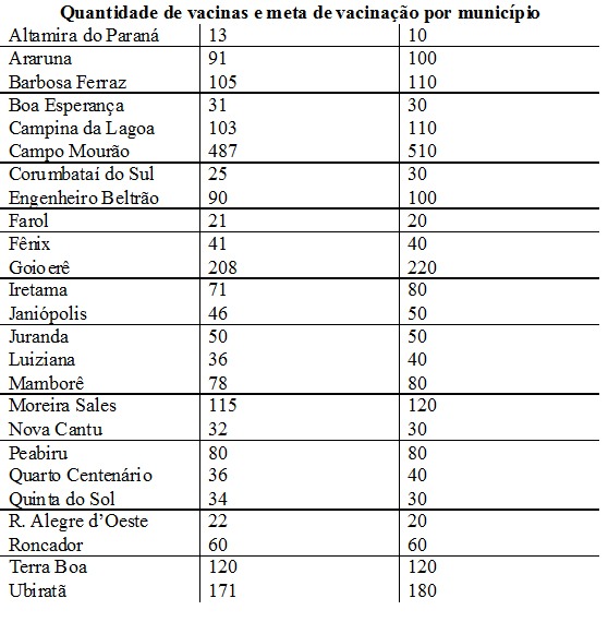 A entrega prossegue às 9h45 nas cidades de Quinta do Sol; Quarto Centenário; Engenheiro Beltrão; Campina da Lagoa; Peabiru; Juranda; Corumbataí do Sul; e Roncador. Por fim. Às 10h30, receberão o imunizante Nova Cantu; Farol; Fênix; Luiziana; Moreira Sales; Iretama; Boa Esperança; Araruna; e Campo Mourão.
