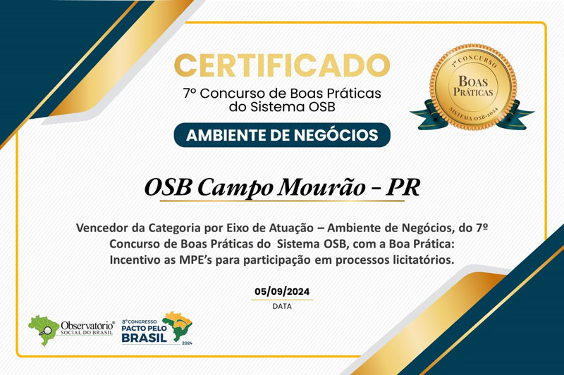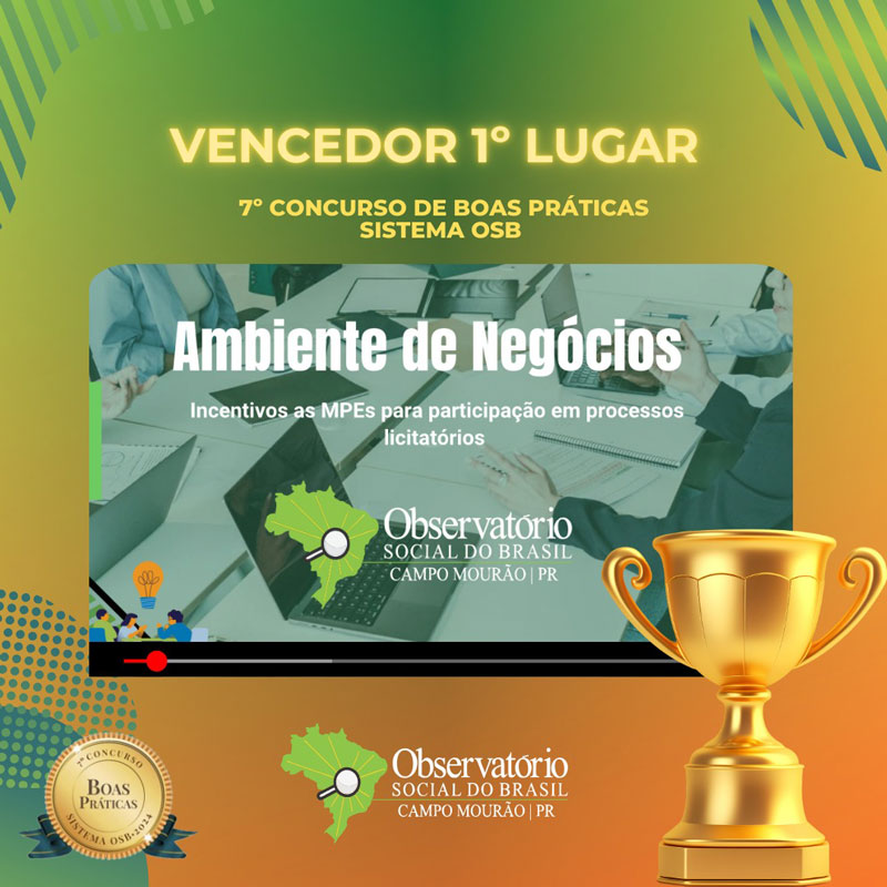 O desenvolvimento de ações voltadas a incentivar a participação de micro e pequenas empresas de Campo Mourão nas licitações realizadas pelo poder público do município assegurou a unidade local do Observatório Social do Brasil conquistar o primeiro lugar no 7º Concurso Nacional de Boas Práticas do Sistema OSB. Neste ano, a unidade foi premiada na categoria “Ambiente de Negócios”.
