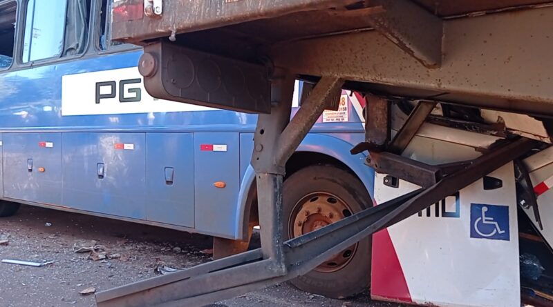 Ônibus com trabalhadores bate e arrasta carreta por 6 metros em CM. Carroceria parou dentro do coletivo