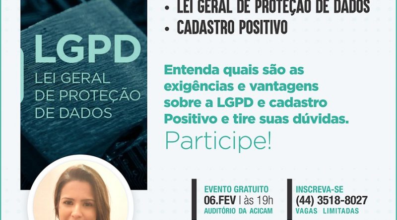 No dia 6 de fevereiro será realizada palestra gratuita no auditório da Associação Comercial e Industrial de Campo Mourão (Acicam) sobre a Lei Geral de Proteção de Dados (LGPD) e o Cadastro Positivo. As vagas são limitadas e as inscrições devem ser feitas através do telefone (44) 3518 8027.