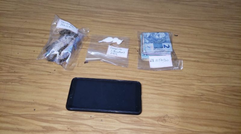 No Jardim Cidade Nova a Rotam recebeu três denúncias de tráfico e receptação. Um usuário conhecido por praticar furtos e levar nas bocas de fumo estava no local. O dono da casa tentou fugir, mas foi preso. Os policiais encontraram 3 buchas de cocaína, um pedaço de maconha e mais de R$ 1,2 mil em dinheiro.
