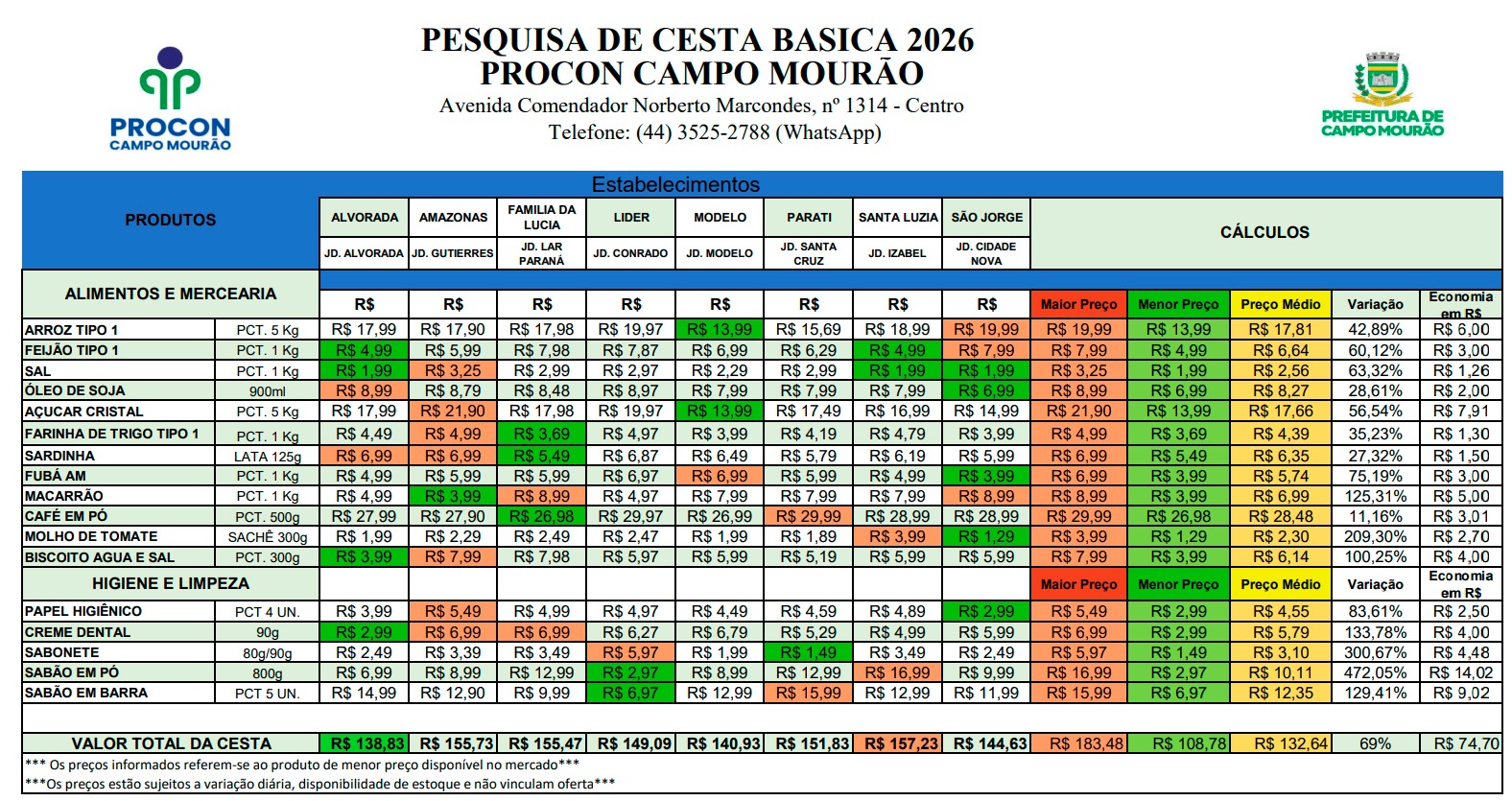 O diretor do Procon, Edilson Moreira Cordeiro, lembrou que os preços informados se referem ao produto de menor preço disponível no mercado no momento da coleta, e que os valores podem variar diariamente, conforme estoque e política de cada estabelecimento. Ele também destacou a importância da pesquisa de preços pelo consumidor no momento da compra.