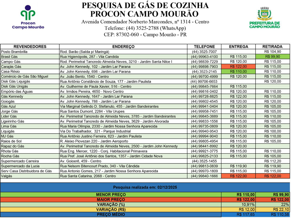 Vale lembrar que a pesquisa tem caráter informativo para o consumidor, permitindo que ele escolha a melhor opção na hora da compra do produto. Além de monitorar preços, o órgão fiscaliza também o peso dos botijões vendidos nas revendedoras locais, para garantir que a quantidade de gás esteja correta.