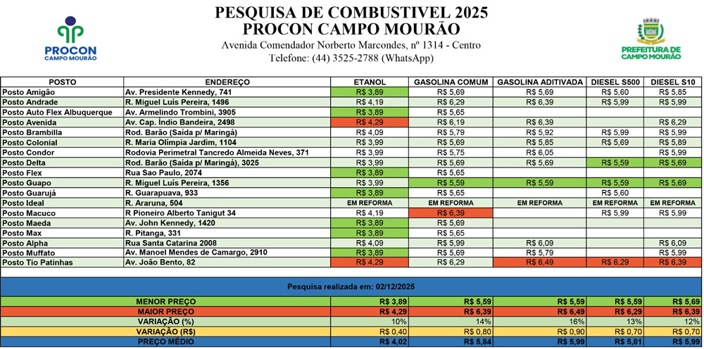 Em relação aos combustíveis, a pesquisa foi feita em 17 estabelecimentos. Foram avaliados os preços do etanol, gasolina comum, gasolina aditivada, diesel S500 e diesel S10. A maior diferença foi encontrada na gasolina aditivada, com uma variação de até 16%, com o litro sendo comercializado entre R$ 5,59 e R$ 6,49 (R$ 0,90 o litro). O preço médio praticado é de R$ 5,99 o litro.