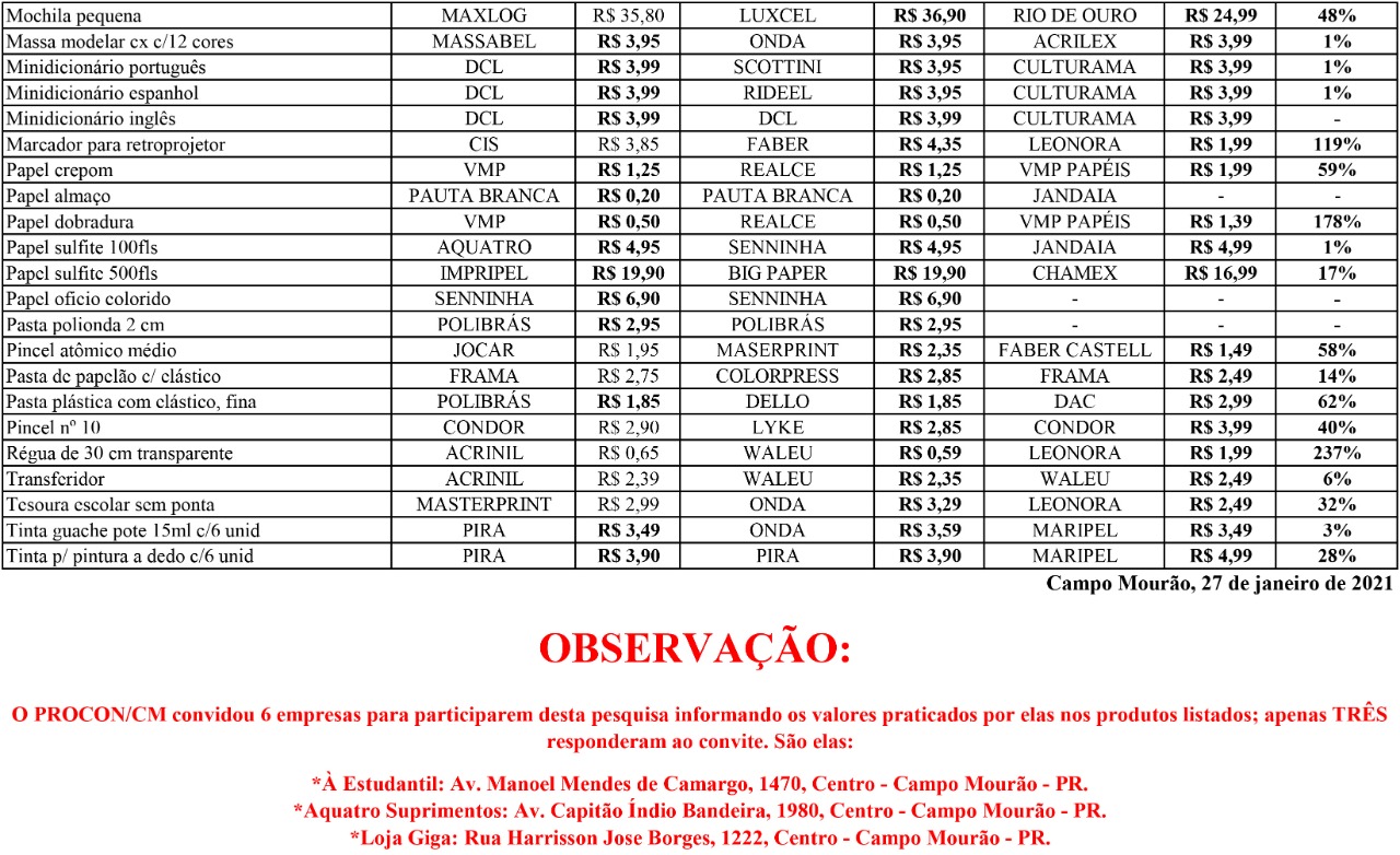 Pesquisa realizada pelo Procon de Campo Mourão aponta que o preço dos materiais escolares no município tem uma variação de até 366%. O levantamento foi feito no dia 27 de janeiro, mas publicado pelo Órgão de Defesa do Consumidor somente nesta semana. O Procon convidou seis empresas para participarem da pesquisa. Porém apenas três responderam: Estudantil, Aquatro Suprimentos e Loja Giga.