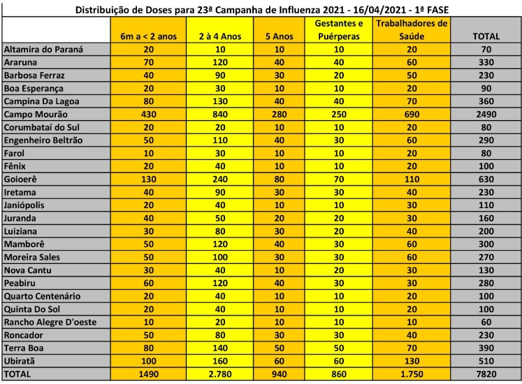 Das doses recebidas pela Regional, 7.290 são da AstraZeneca e 4.660 da CoronaVac. Campo Mourão receberá um total de 3.420 doses, sendo 1.920 da CoronaVac e 1.500 da AstraZeneca. Veja abaixo a quantidade de doses por município.