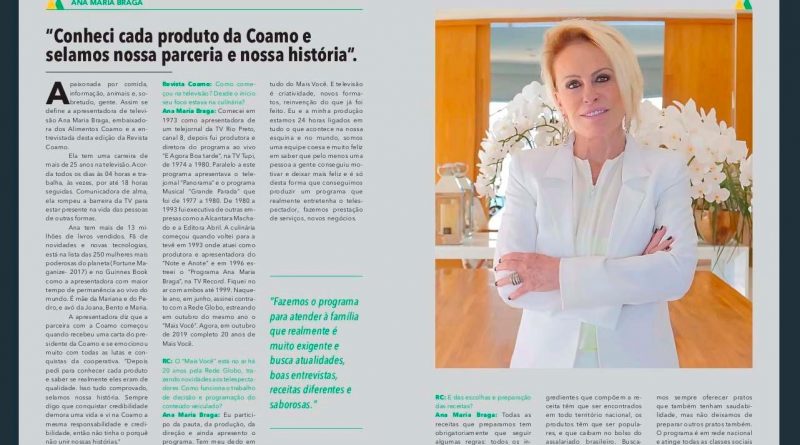 Com uma carreira de mais de 25 anos na televisão, a apresentadora global, Ana Maria Braga, foi a entrevistada da última edição da Revista Coamo. Eleita a embaixadora dos Alimentos Coamo, ela conta um pouco da sua trajetória profissional e pessoal. Além disso, a comunicadora que está a frente do programa Mais Você, revela como foram as tratativas para iniciar sua parceria comercial com a maior cooperativa da América Latina, Conheci cada produto da Coamo e selamos nossa parceria e nossa história.