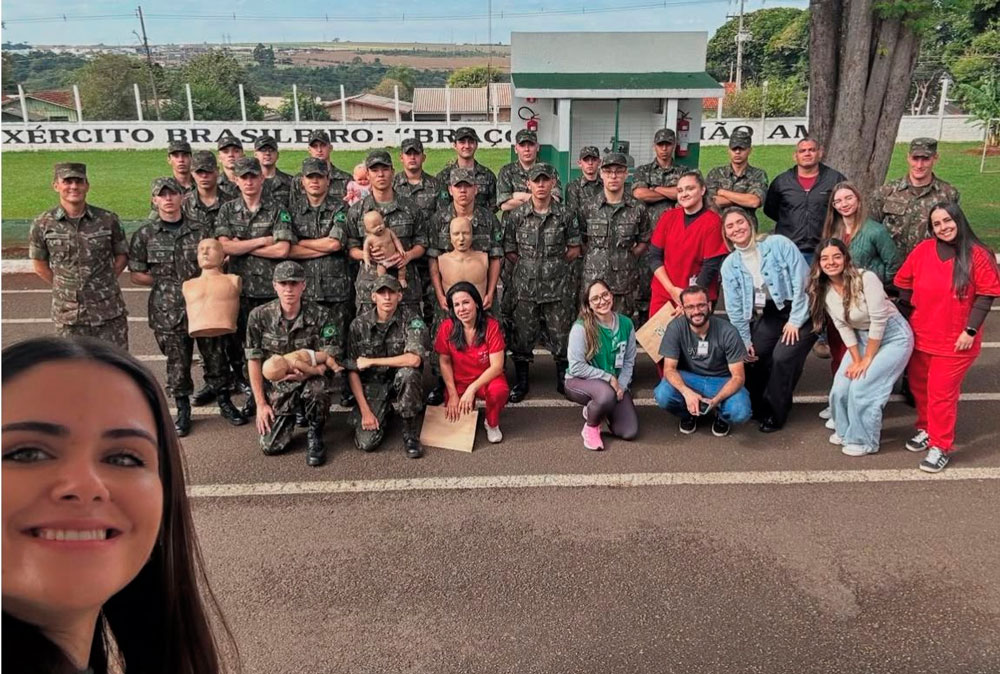 Acadêmicos do último ano da graduação também ministraram uma capacitação em Atendimento Pré Hospitalar para o Tiro de Guerra de Campo Mourão. Foram capacitados 20 soldados com conhecimento teórico e prático para atendimento a desengasgo e reanimação cardíaca de adulto e criança.