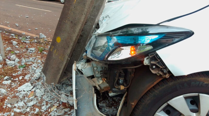 Veículo bate e quebra poste após ser atingido por outro carro no centro de Campo Mourão