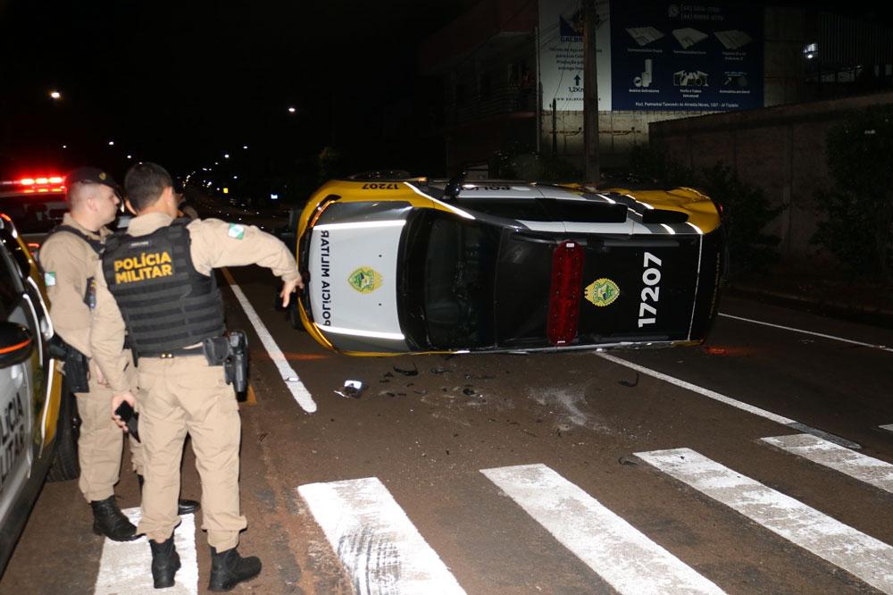 Uma viatura da Polícia Militar (PM) tombou após se envolver em um acidente com um Jeep Renegade na noite desta quarta-feira (29), na Perimetral Tancredo de Almeida Neves, em Campo Mourão. O acidente mobilizou equipes do SAMU, Corpo de Bombeiros e demais guarnições da PM.