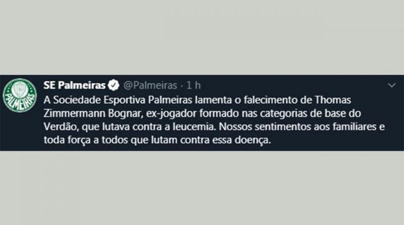 A Sociedade Esportiva Palmeiras lamenta o falecimento de Thomas Zimmermann Bognar, ex-jogador formado nas categorias de base do Verdão, que lutava contra a leucemia. Nossos sentimentos aos familiares e toda força a todos que lutam contra essa doença.