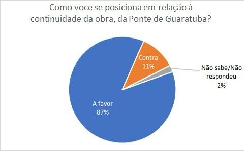 Pesquisa contratada pela Associação dos Jornais e Portais do Paraná (ADI-PR) junto ao Instituto IRG Pesquisa revela que 88% dos cidadãos do Paraná querem a continuidade das obras da Ponte de Guaratuba. O levantamento foi realizado entre 4 e 7 de outubro e ouviu 1.860 paranaenses. Destes, 1.628 manifestaram-se a favor do seguimento da obra, contrariando decisão judicial que suspendeu os trabalhos.