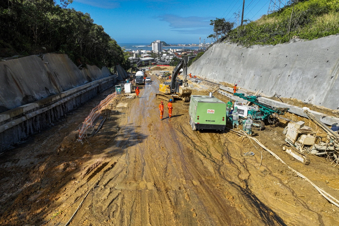 Em julho, um dos principais avanços da obra contemplou os serviços de contenções no lado de Guaratuba, com a execução do solo grampeado, estaca raiz, tirantes e vigas de travamento, bem como a escavação para rebaixamento do morro no acesso à região de Caieiras.