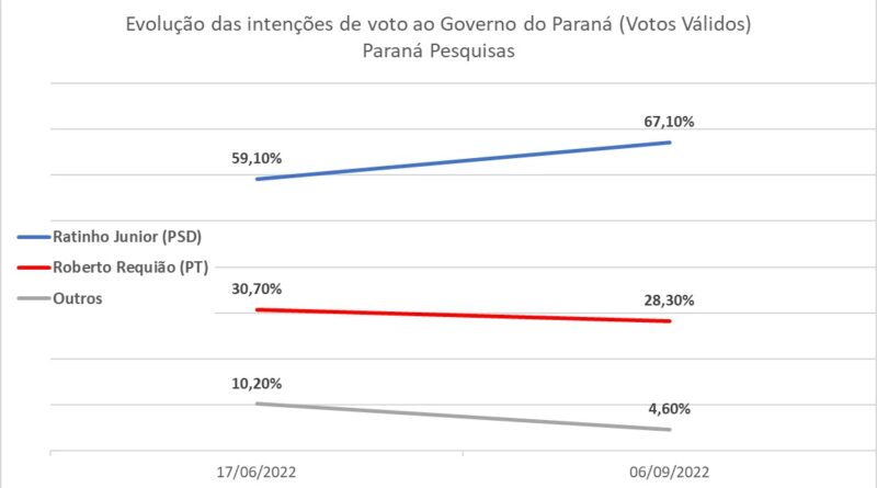 Ratinho Junior chegou a 67,1% dos votos válidos, um crescimento de 8 pontos percentuais em relação ao último levantamento da Paraná Pesquisas, realizado em 17 de junho. No mesmo período, Requião caiu de 30,7% para 28,3% dos votos válidos, enquanto os demais candidatos não apareciam na sondagem anterior. A 26 dias da votação e com mais do que o dobro das intenções de voto de seus adversários somados, o atual governador se encaminha para mais quatro anos de mandato à frente do Palácio Iguaçu.
