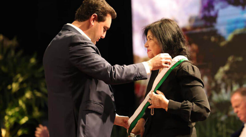 A engenheira agrônoma e pesquisadora Mariangela Hungria recebeu, nesta terça-feira (19), do governador Carlos Massa Ratinho Junior, a Ordem do Pinheiro – maior comenda do Paraná. A homenagem à cientista, cujos trabalhos têm impacto direto na sustentabilidade agricultura, foi realizada durante o 13º Consórcio de Integração Sul e Sudeste (Cosud), no Teatro Guaíra, em Curitiba. O evento também serviu como abertura da Conferência da Mata Atlântica, cuja programação segue até quinta-feira (21) no Parque Barigui.