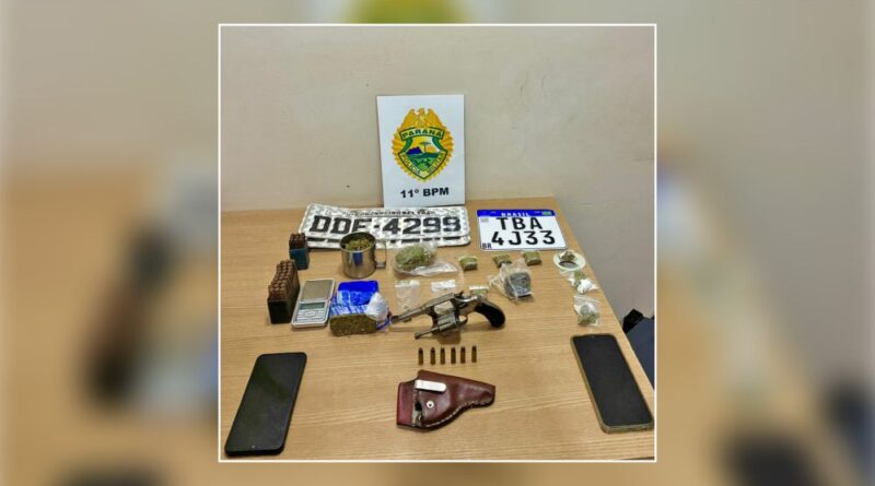 Prisão de três adultos em Campo Mourão resultou na apreensão de drogas, arma de fogo e uma motocicleta furtada com sinais de adulteração.