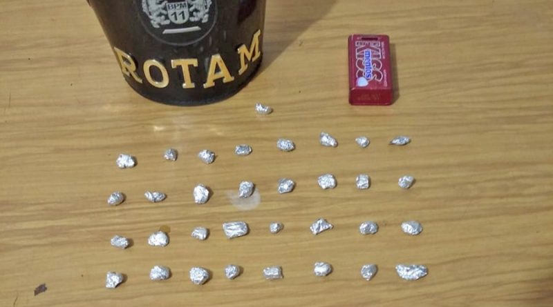 Os policiais tentavam localizar uma motocicleta roubada no bairro quando viram o jovem em atitude suspeita. Ao perceber a presença da viatura ele jogou um objeto no chão, que a PM constatou se tratar de uma pequena caixa de metal com 33 pedras de crack embaladas com papel alumínio.