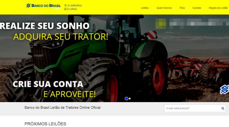 Segundo a PM, o site identificado como https://www.bbtratoresleiloes.com/home/ usa uma foto na capa da página com vários veículos e maquinários, com slogan falsificado do Banco do Brasil.