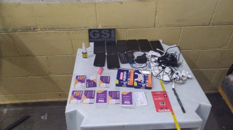 Após o flagrante e abordagem pessoal ao homem, foi encontrado em sua mochila dez aparelhos celulares, dez carregadores, uma serra, uma broca, um pen drive, nove chips de celular e um tubo de cola.