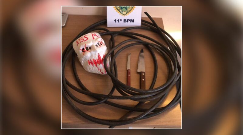 Durante a abordagem, também foi apreendida uma máscara branca com detalhes em vermelho, usada pelo suspeito durante o delito. Todo o material foi recolhido.