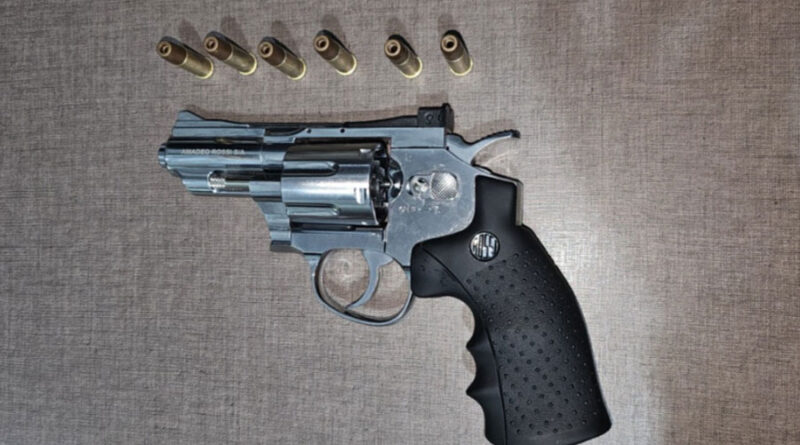 Em busca nas imediações, os policiais localizaram um revólver cromado, de aparência idêntica a uma arma de fogo real. O objeto foi verificado e confirmado como um simulacro de pressão calibre 4,5 milímetros, sem a ponta laranja de sinalização, e municiado com seis esferas de aço, simulando munições de calibre .38.
