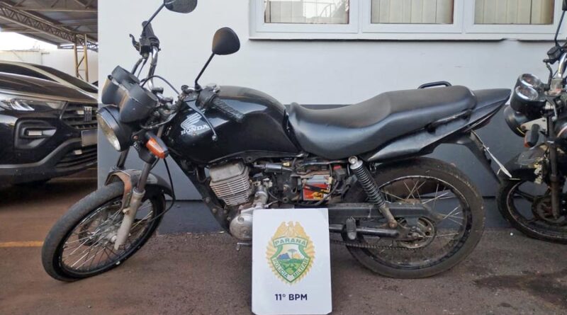 Uma equipe da Polícia Militar (PM) recuperou, no final da tarde dessa sexta-feira (21), uma motocicleta Honda CG 150 com registro de furto. O veículo estava abandonado na entrada de uma fazenda, localizada na rodovia que liga Campo Mourão a Luiziana, na área rural do município.