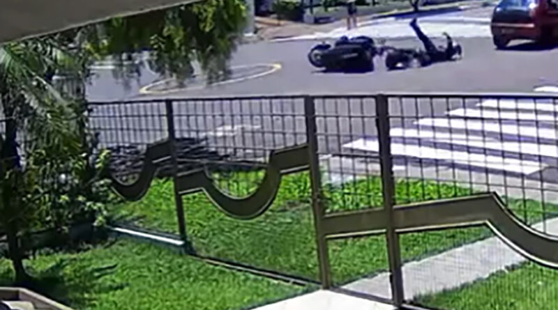 Com o impacto, o motociclista foi arremessado no asfalto, sofrendo ferimentos. Câmeras de segurança de imóveis registraram o momento da colisão.